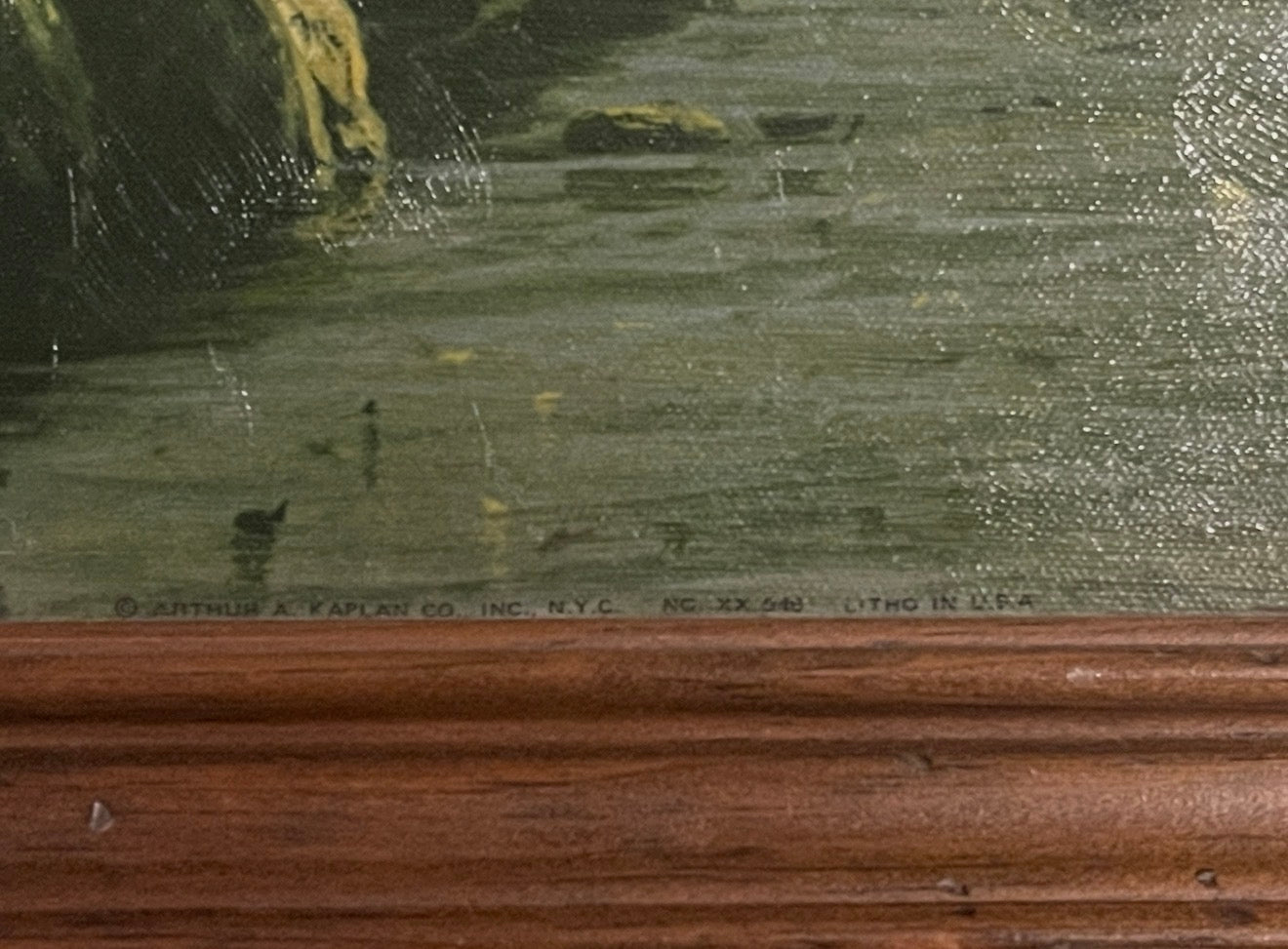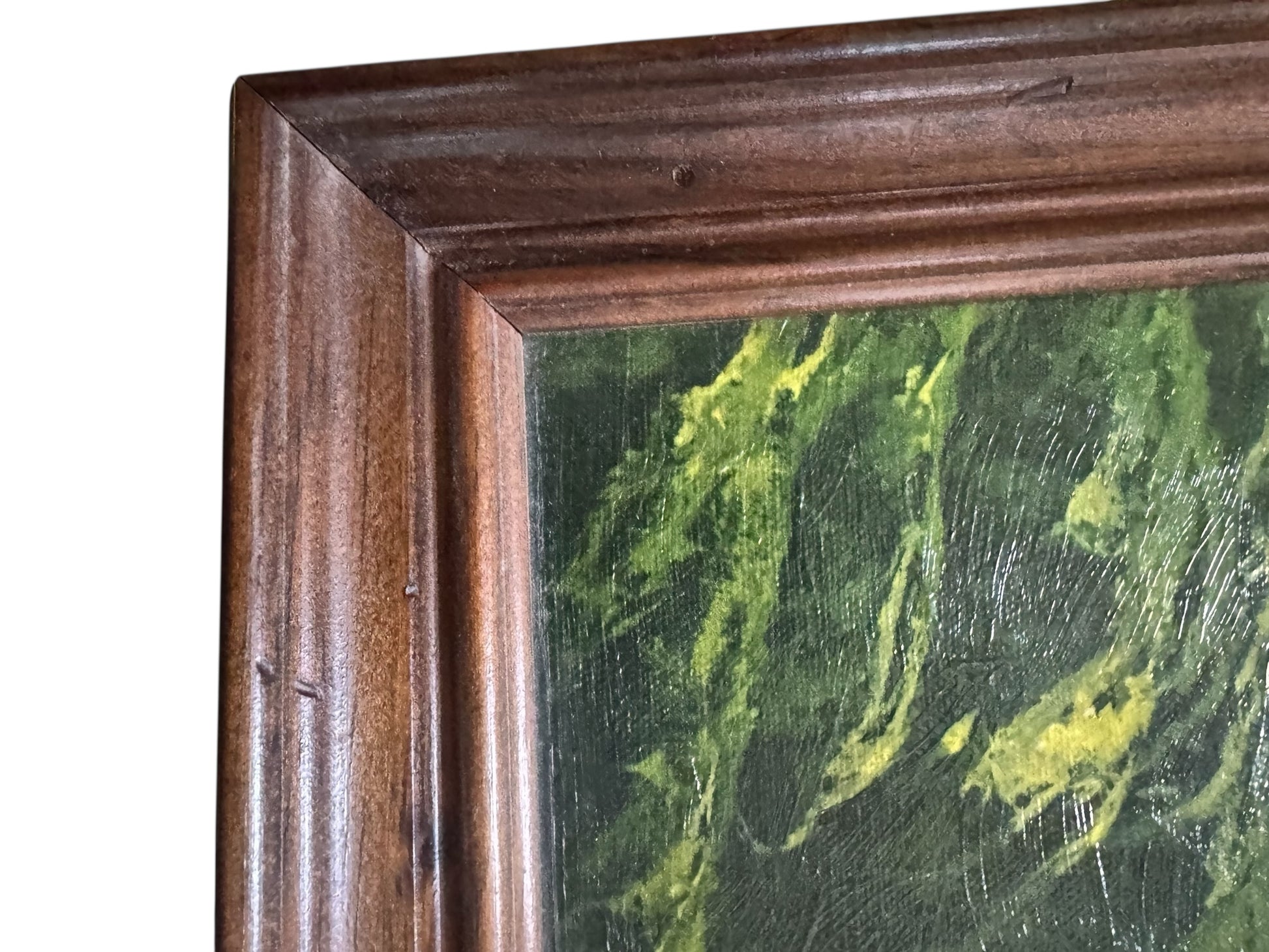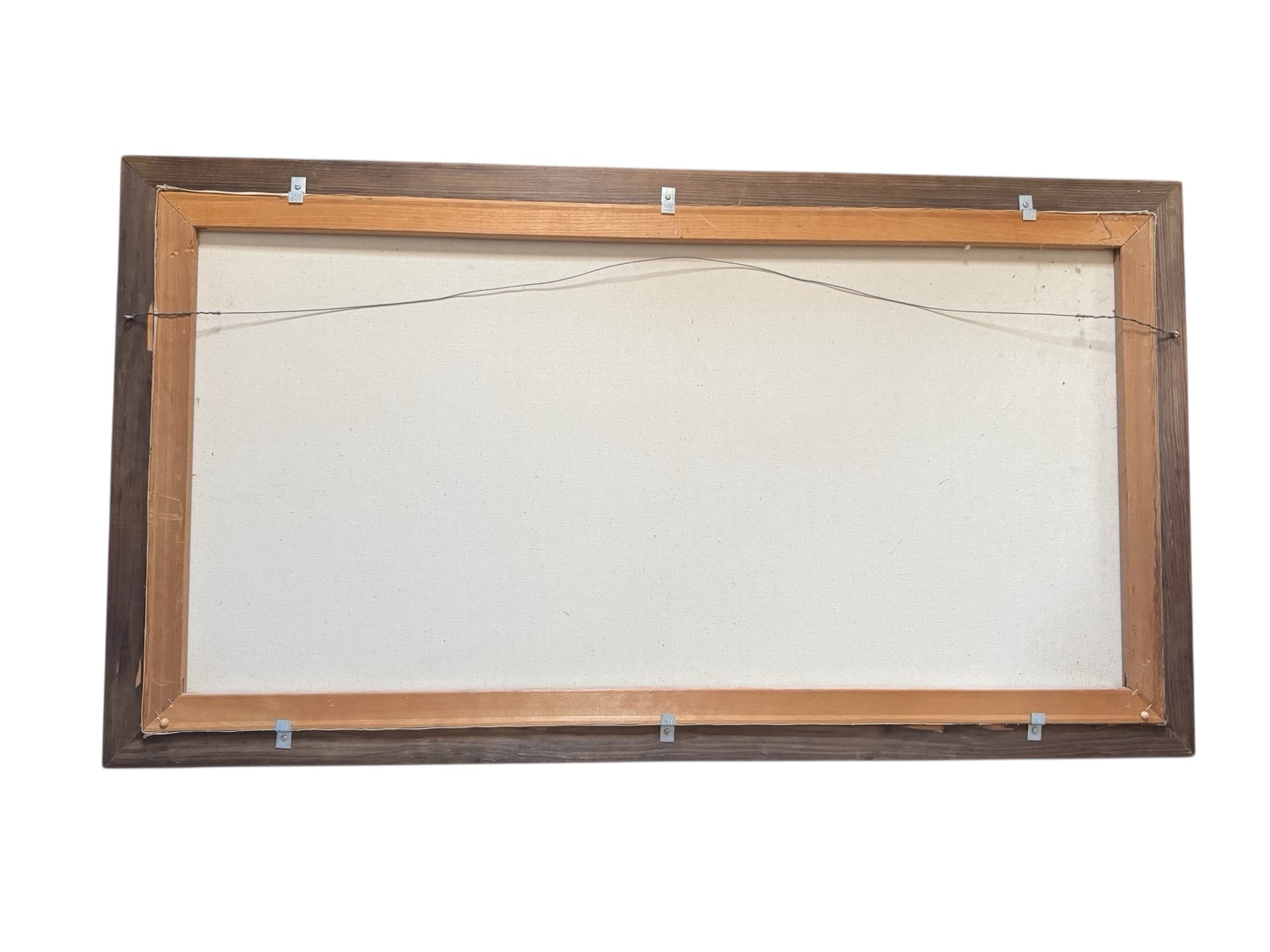 Condition: Vintage condition with visible surface wear consistent with age and display. The frame has minor scuffs/nicks (see close-ups). Hanging wire present on back; hardware appears older and may be worth updating for modern hanging confidence.